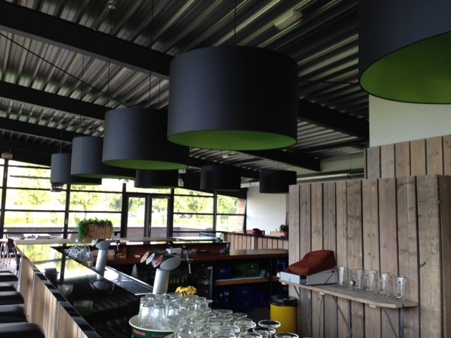 Voor deze gezellige voetbalvereniging hebben wij prachtige lampenkappen op maat gemaakt. De club kreeg recent een nieuw clubgebouw met veel steigerhouten elementen, een hoge ruimte met rondom glas.